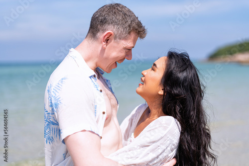 Love couple on holiday happy playing running along the beach and sweet kiss on love emotion