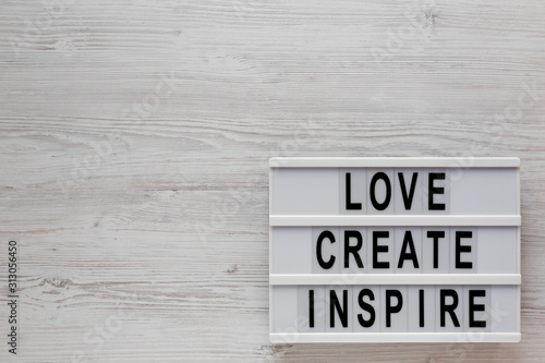 'Love create inspire' words on a lightbox on a white wooden background, top view. Overhead, from above, flat lay. Space for text.