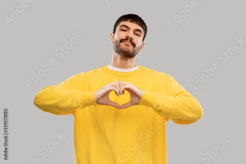 love, valentine's day and people concept - young man in yellow sweatshirt girl making hand heart gesture over grey background