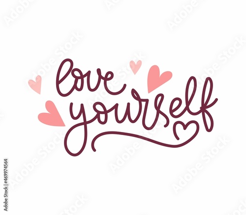 Love yourself lettering quote with pink hearts. Motivational self love and care modern calligraphy design. Vector illustration. Inspirational quote for Women's day, Healthcare, Body positive.