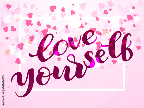 Love yourself lettering. Vector illustration. Confetti in the form of hearts.