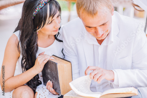 Lovely couple outdoors smiling cuddling and reading books, decor, peonies, flowers, lifestyle, marriage, family, love