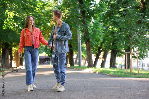 Lovely couple walking together in park, space for text