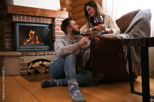 Lovely couple with glasses of wine near fireplace indoors. Winter vacation