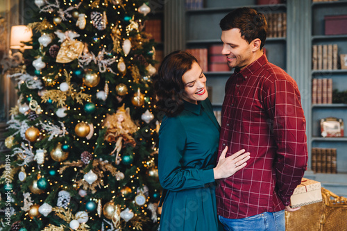 Lovely family couple: pretty wife stands near her husband who prepares New Year present for her. Good relationnship concept. Woman and man stand against decorated Christmas tree. Winter holidays
