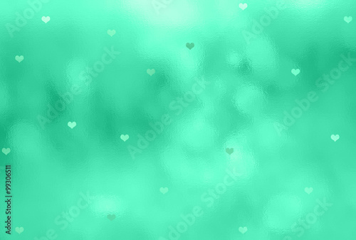 Lovely green color blurry glass textured window details with beautiful small Valentine's Day Heart symbols illustration background. Lovely Valentine Holidays greeting card copy space background.