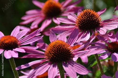Lovely lilac flowers (Echinacea) are blossoming in a garden in sunny summer day.