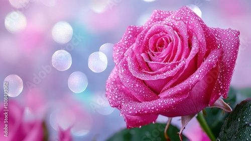 Lovely pink rose covered in glimmering water droplets captured in soft natural light outdoors