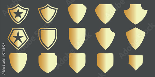 Lovely silhouettes of shields made in gold. Labels for the police, military, soccer, and other sports are shaped by golden badges.