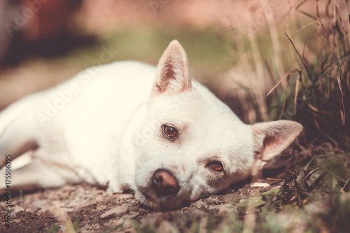 lovely white dog lying on the grass and relaxing, looking beautfiul (color toned image)