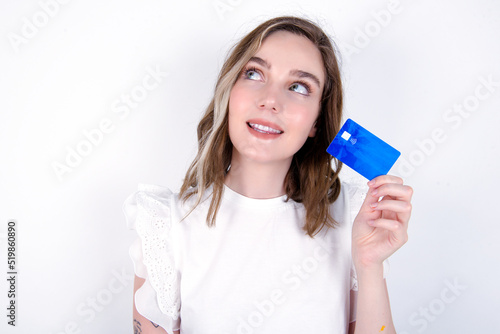 Lovely young caucasian woman wearing white T-shirt over white background showing credit card and looking away at copy space. Pensive