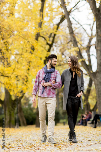 Lovely young couple in the autumn forest