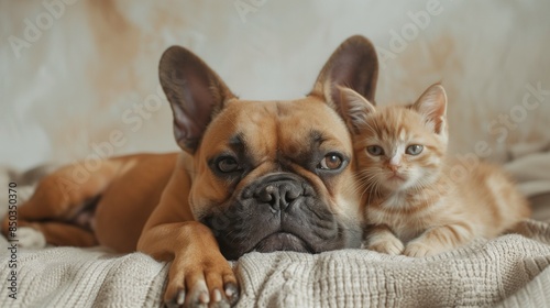 Loving and happy scene of a smiling brown French Bulldog sitting together with a cute ginger kitten against a simple light-colored backdrop, capturing the essence of friendship and joy