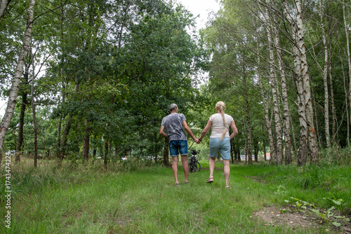 Loving couple holding hands, walking away on a green grass path in a forest of birch trees, showing togetherness, romance, and an active lifestyle outdoors with a bike