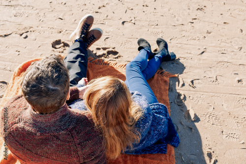 Loving couple walks on beach along sea on sunny autumn day. Weekend and lifestyle concept. Back view. High quality photo