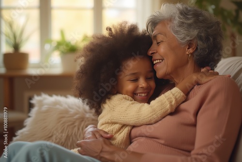 Loving grandmother hugging granddaughter at home, showing family bond and intergenerational love