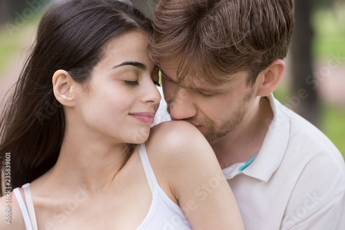 Loving man kissing attractive woman with closed eyes shoulder with tenderness, young couple in love on walk in park, enjoying romantic moment together outdoors, feeling intimacy and closeness close up