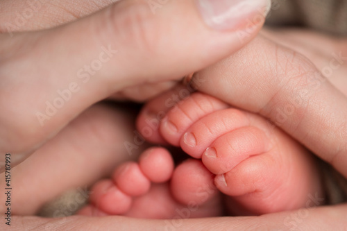 Loving mom hold baby's legs. Happy childhood. Parental care. Concept of a happy family.