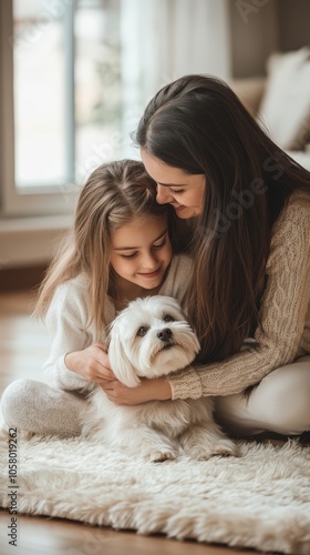 Loving Moments: Mother, Daughter, and Their Dog in a Cozy Home Setting