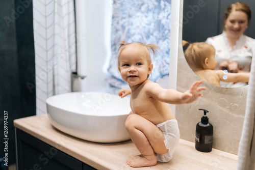 Loving mother supporting toddler daughter sitting on bathroom sink, wearing diaper, mirror reflecting joyful parent-child bonding moment. Concept of family bonding and hygiene.