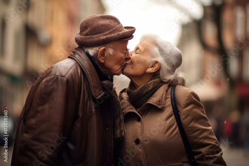 loving old couple kissing at the street, AI Generative