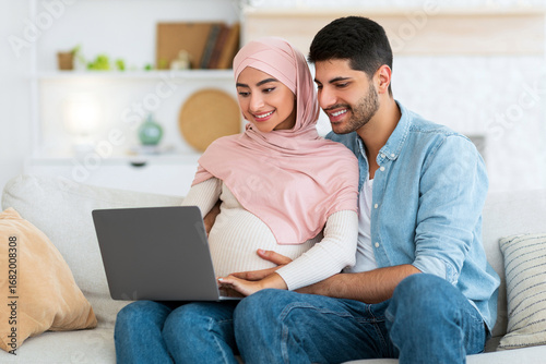 Loving pregnant muslim couple using laptop computer, watching movie together at home, resting on sofa in living room, expecting arab lady spending time with her husband, empty space