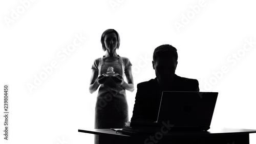 Loving woman in apron with cake looking at working husband, tasty surprise