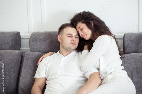 Loving young couple in white clothes hugging and relaxing on sofa at home. Love, family, happiness concept