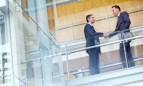 Low angle, business people or handshake in corporate modern office, finance company or investment startup. Men, shaking hands or partnership gesture for workers in welcome greeting or thank you deal
