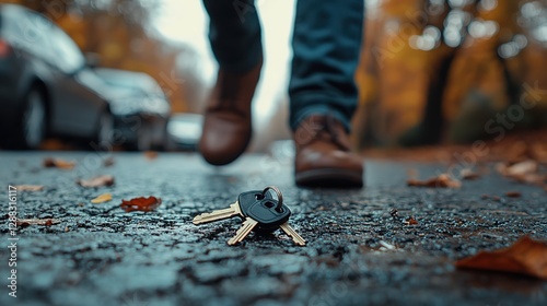 Low angle closeup photography of a man who lost his car keys. Keys on the asphalt street, man walking away from him, forgetting to pick it up. Dropped on the ground , 8k image