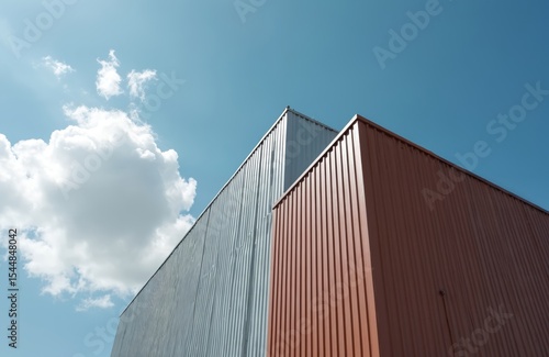 Low angle perspective of modern brown office building against clear blue sky. White clouds, corrugated metal industrial exterior. Business, corporate architecture. Brown, white, blue colors,