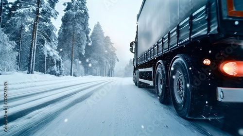 Low angle photography of a gray cargo semi truck with trailer driving on the snowy asphalt road surrounded by forest trees. Winter season travel and transportation, snowfall trucking job
