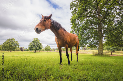 Low angle portrait of a brown male Cleveland Bay horse (Equus ferus caballus) on a Scottish countryside farm.
