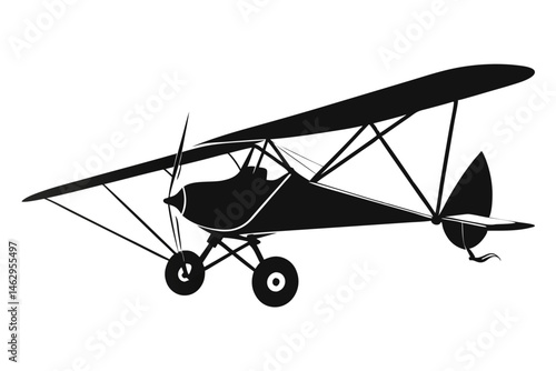Low angle silhouette showcases a vintage biplane with front propeller and tail ribbon