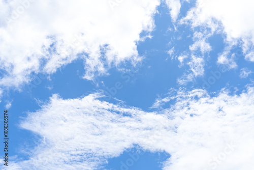 Low angle view and full frame of beautiful blue sky with strange shape of clouds in the morning or evening in sunny day used as natural background texture in decorative art work.