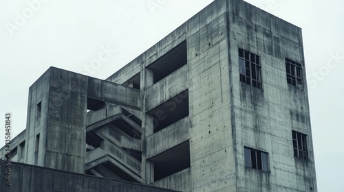 Low angle view of a weathered, multi-story concrete building with exposed staircases and broken windows.