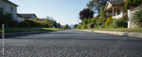 Low angle view of clean, black asphalt road leading through suburban neighborhood on bright, sunny day. Neat residential houses with green lawns, trees line street, creating peaceful, structured