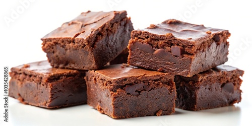 Low angle view of delicious chocolate brownies surrounded by chocolates on a white background