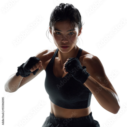 Low center shadowboxing Asian woman refining agility transparent