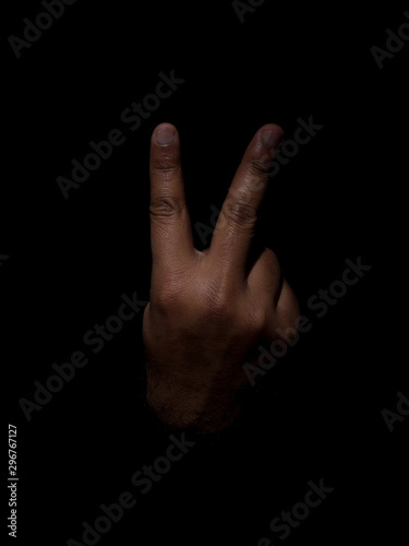 Low key photo of a brown man showing the back of the hand with two fingers sticking out indicating the number two