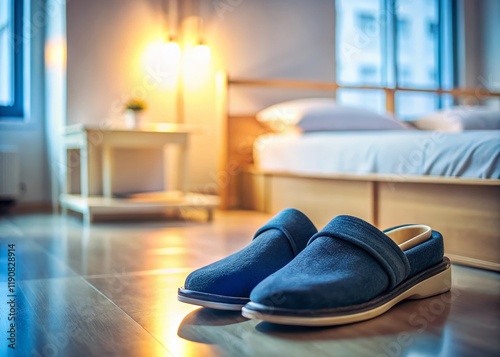 Low Light Hospital Room: Navy Blue Slippers by Bedside Table
