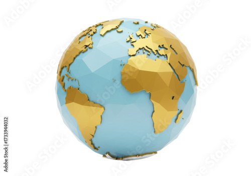 Low poly globe isolated on transparent background, 3D rendering of Earth with golden continents and blue ocean for geography and travel concepts