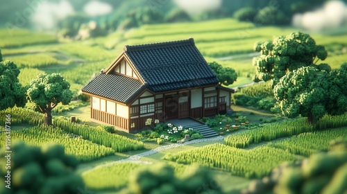 Low poly traditional Japanese farmhouse nestled in vibrant green fields, serene rural landscape, harmonious design, cultural heritage