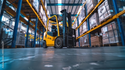 Low view of forklift in shipyard warehouse
