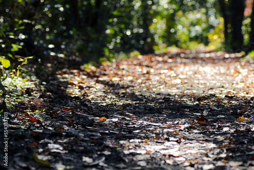 low-angle nature photo of a mountain path covered with fallen leaves in the beautiful autumn sunshine.