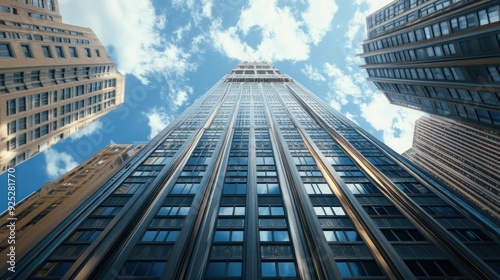 Low-Angle View of a Tall Skyscraper with a Blue Sky and White Clouds