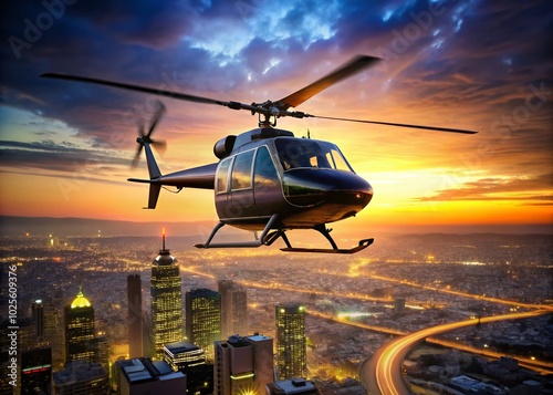 Low-Flying Helicopter Over Urban Landscape at Dusk with City Lights and Shadows in the Background