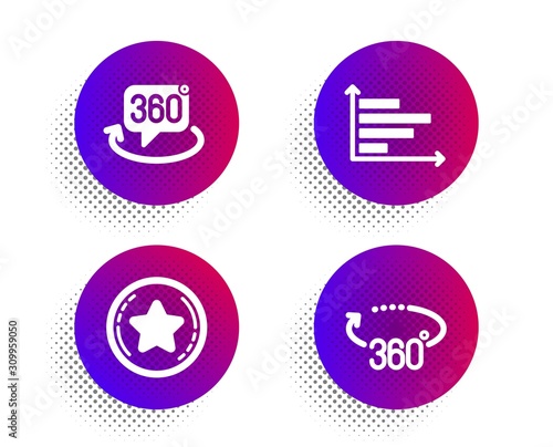 Loyalty star, Horizontal chart and 360 degree icons simple set. Halftone dots button. 360 degrees sign. Bonus reward, Presentation graph, Virtual reality. Full rotation. Technology set. Vector