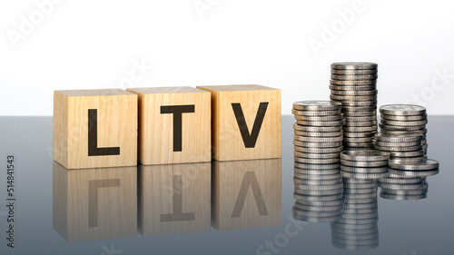 LTV - text on wooden cubes on a cold grey light background with stacks coins