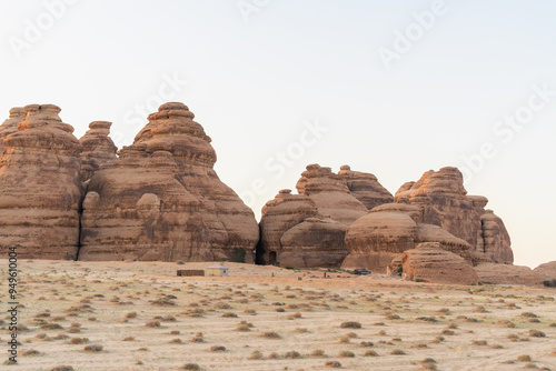 Luftaufnahme von Schluchten, Klippen, Felsen und Felsformationen in der Landschaft im Wüstenland AlUla Medina Saudi-Arabien